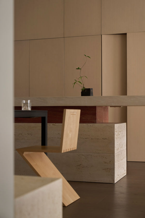 Throughout both axes, materials are kept within a neutral palette, letting their textures and natural tones come through: rough-cut veneer on cabinetry, carved timber drawers, red travertine set against beige limestone, square bluestone tiles, handmade ceramics in white and brown, and wide-plank dark timber flooring. Mirrors appear in understated locations - beneath wardrobes, inside compartments, and along an entry panel - subtly expanding the space and adding a rhythmic visual layer.